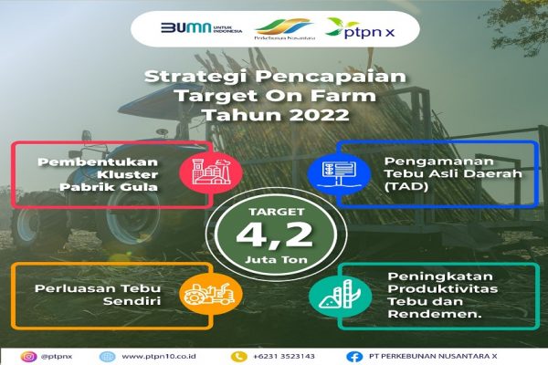 Pada Musim Giling Tahun 2022 ini, PT Perkebunan Nusantara (PTPN) X menargetkan menggiling tebu sejumlah 4,2 juta ton dengan total produksi gula 340 ribu ton. Berbagai upaya dilakukan untuk mencapai target di sisi on farm tersebut, mulai dari pembentukan kluster pabrik gula, perluasan Tebu Sendiri (TS), Pengamanan Tebu Asli Daerah (TAD), hingga peningkatan produktivitas tebu dan rendemen.