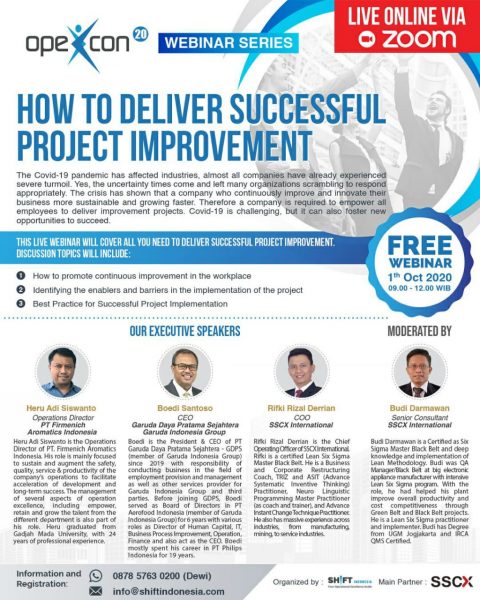 Webinar yang akan diadakan pada tanggal 1 Oktober 2020 ini akan mengangkat tema “How to Deliver Successful Project Improvement?” Materi ini akan dibawakan langsung oleh tiga pembicara hebat dan berpengalaman, yaitu Heru Adi Siswanto, Operations Director PT Firmenich Aromatics Indonesia, Boedi Santoso, CEO Garuda Daya Pratama Sejahtera – Garuda Indonesia Group, Rifki Rizal Derrian, COO SSCX International. Register for free http://bit.ly/WBSeries