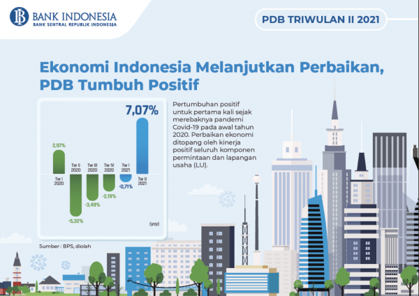 Perekonomian Indonesia pada triwulan II 2021 mencatat pertumbuhan positif untuk pertama kali sejak merebaknya pandemi Covid-19 pada awal tahun 2020, sebesar 7,07% (yoy).