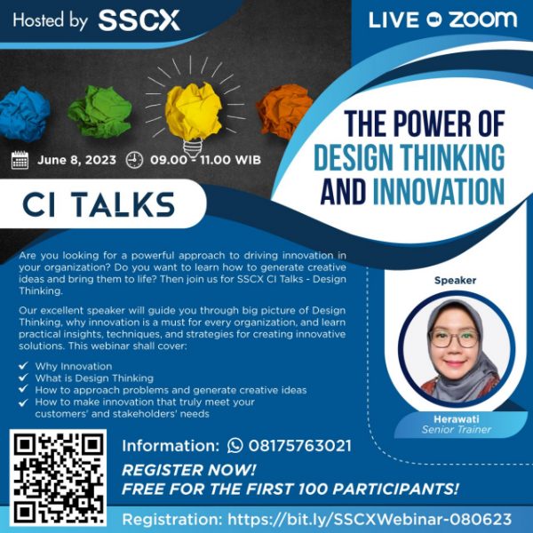 Excellent people, singkatnya design thinking menyediakan pendekatan terstruktur dan berpusat pada manusia dalam pemecahan masalah dan inovasi. Menggunakan design thinking, kita dapat memahami kebutuhan pelanggan dengan lebih baik, menciptakan solusi bernilai tambah, dan mendorong inovasi di organisasi kita. Yuks kita pelajari DESIGN THINKING di webinar The Power of Design Thinking & Innovation, 8 Juni 2023. Acara diselenggarakan oleh SSCX International khusus untuk Anda para pegiat inovasi, daftar sekarang di https://bit.ly/SSCXWebinar-080623 GRATIS!!
