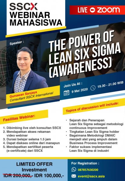 Lalu apa hubungannya dengan kami (mahasiswa)? Dengan memahami Lean Six Sigma melalui webinar SSCX, maka kalian punya nilai plus baik saat proses pencarian kerja maupun peningkatan karier. Jadi tunggu apalagi, segera daftarkan diri Anda karena kuota dan promosi terbatas, ya! Info dan pendaftaran : Wa.me/6287857630200