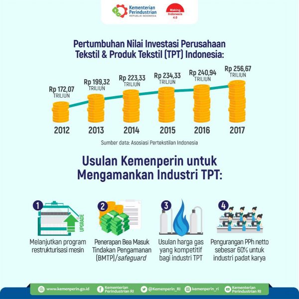 Untuk mencapai target ekspor tahun ini, dibutuhkan penambahan investasi baru dan ekspansi di setiap sektor industri TPT. Peningkatan kapasitas di seluruh sektor industri TPT ini diharapkan dapat menimbulkan efek ganda, yaitu penurunan impor melalui substitusi impor dan dukungan terhadap penyerapan tenaga kerja. Untuk merealisasikan target tersebut, Kementerian Perindustrian mengusulkan agar program restrukturisasi mesin tetap dilanjutkan, diberlakukan penerapan bea masuk tindakan pengamanan (BMTP), usulan harga gas yang kompetitif bagi industri TPT, dan pengurangan PPh netto sebesar 60 persen untuk industri padat karya.